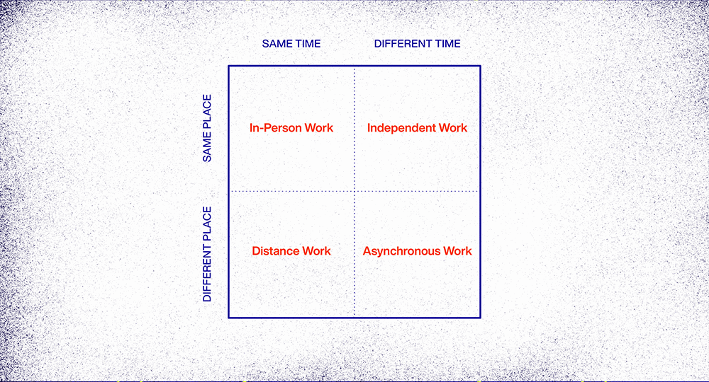 The monopoly office furniture has had on work continues to erode. If we compare work between the same and different times and places, we can identify four work modes: In-Person work, Individual work, Distance work, and Asynchronous work. A traditional physical office may be required in only one of these four scenarios.